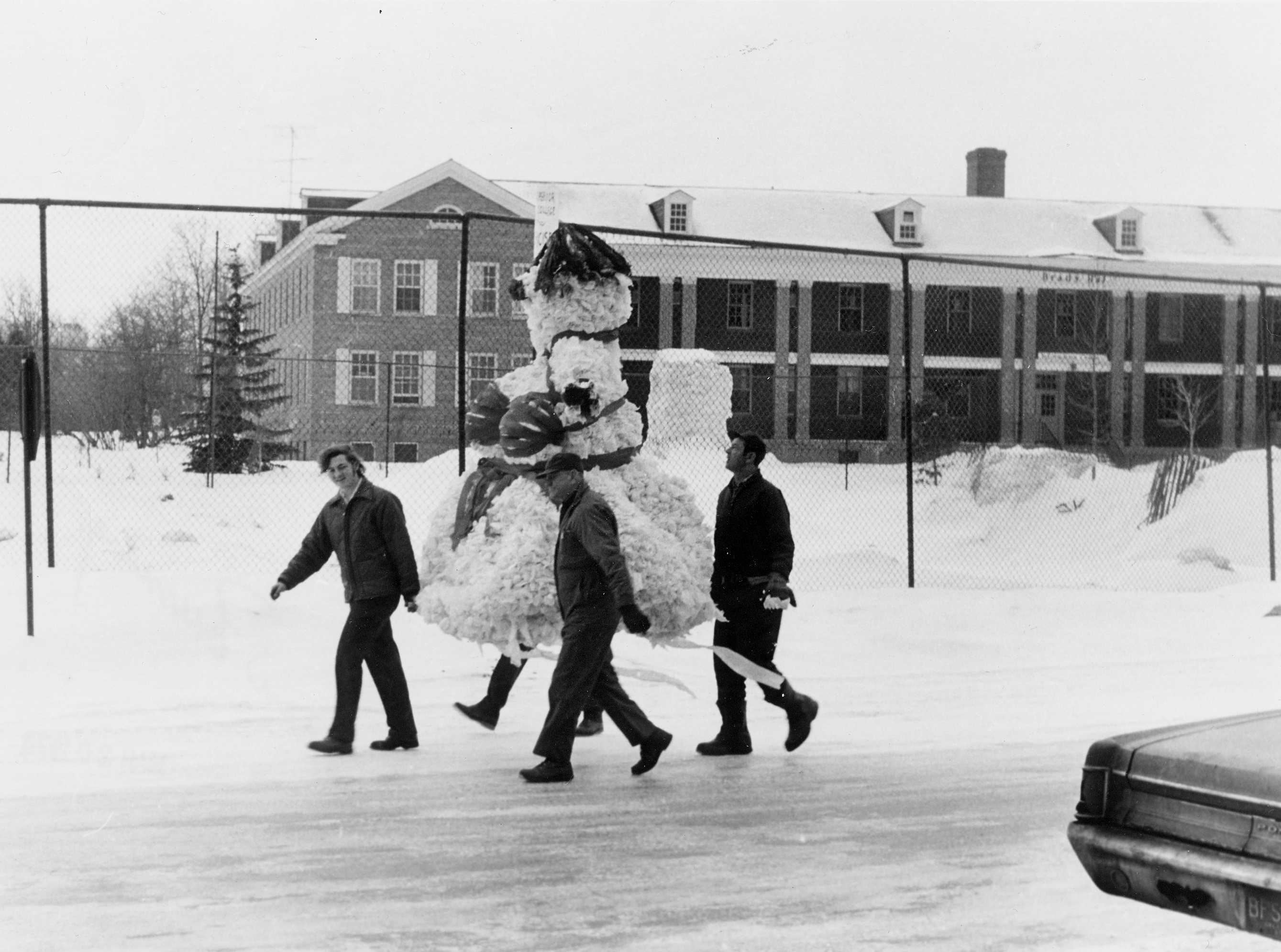 In 1980, during the Iran Hostage Crisis, a Snow Ayatollah Khomeni was burned. Two years later, at a time when cloning was first in the news, a "snow clone" went up in flames. In the late 1980s and early '90s, the snowman took on the form of a hypothetical player of a rival hockey team, usually of a team that the Lakers were soon to play. After complaints that this brought bad luck, this theme was dropped. In 2009, the snowman represented corporate greed.