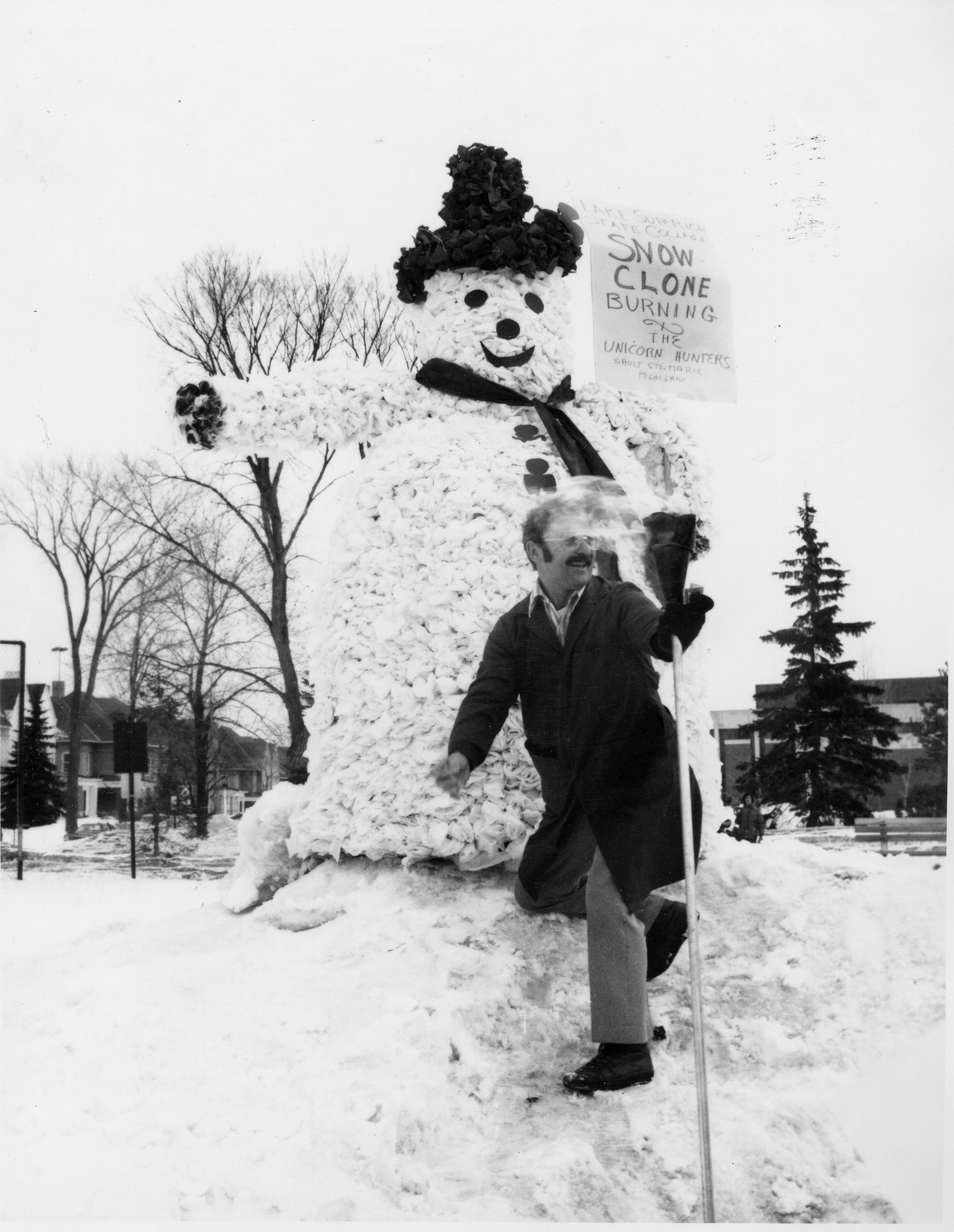 Every year, at Lake Superior State University (LSSU) in Sault Ste. Marie, Michigan, a large paper snowman is burned to celebrate the end of winter and to welcome spring. Known as Snowman Burning, the event was first held in 1971, being started by the Unicorn Hunters, a now-dissolved LSSU student club. Held on the first day of spring, legend says the smoke that is given off during the burn wards off blizzards and ushers in the new season.