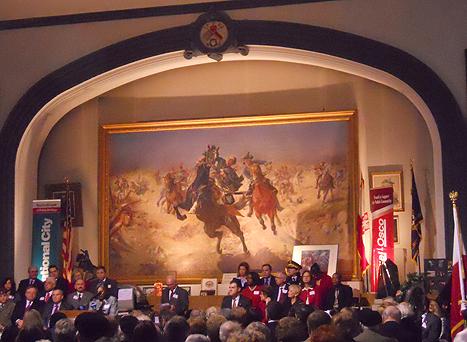 Although the day does not have the same hold on Illinois or Chicago that it once had, it is still celebrated by many. Pulaski became an honorary citizen of the United States in 2009. His name and image still appear all over Chicago. The Polish Museum of America preserves Polish heritage. On Pulaski Day, the president of the Polish Roman Catholic Union presides over a ceremony at the Great Hall in the museum. Behind the ceremony hangs a large painting of Pulaski being mortally wounded at Savannah. An honor guard is present in bright red and blue eighteenth-century cavalry uniforms. There is free Polish food, and the event is open to the public.